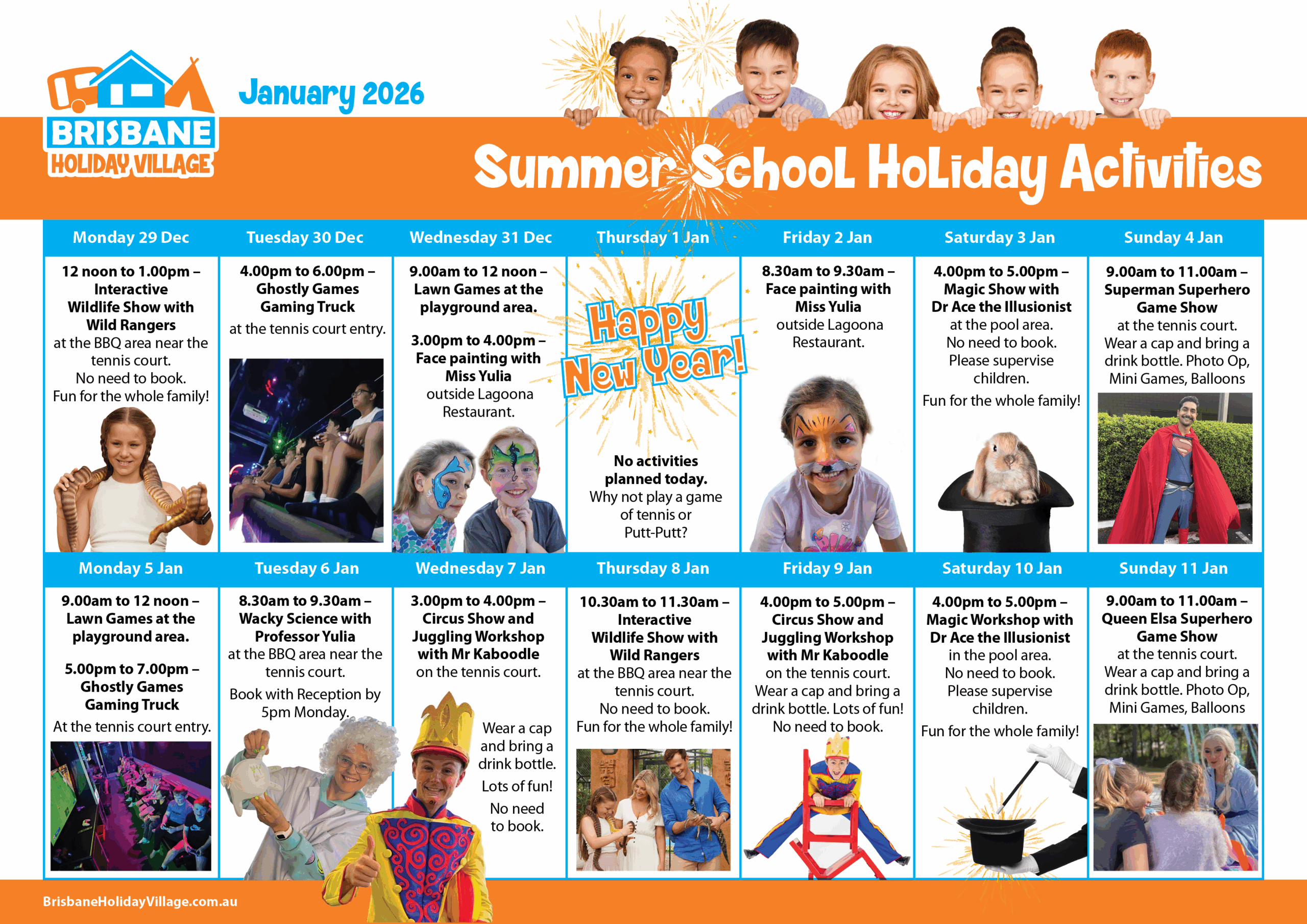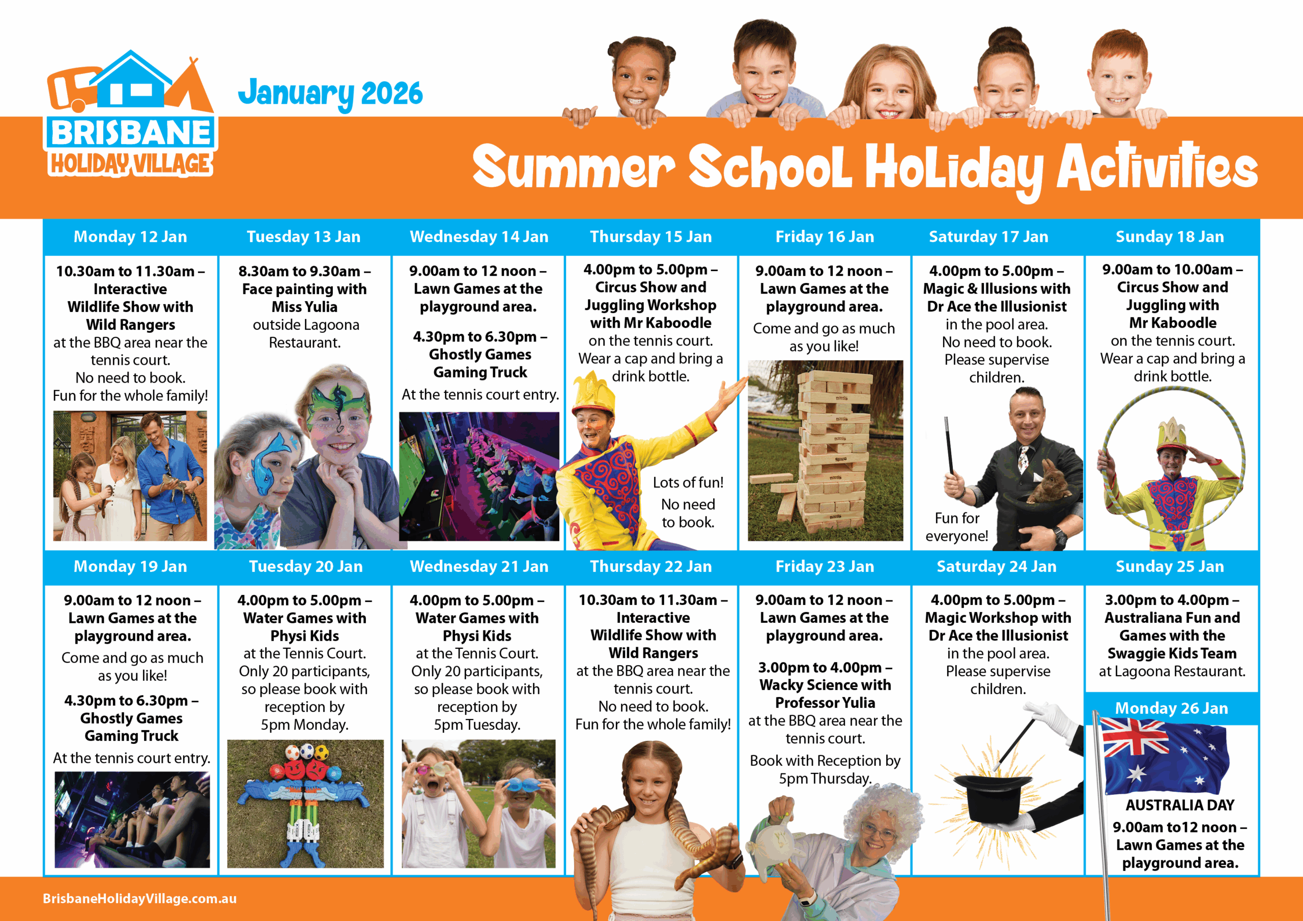 If minimum numbers are not met, holiday activities may be cancelled. Brisbane Holiday Village may need to make adjustments to holiday activities and cancel others depending on weather events, availability etc. In these instances, we will send guests staying in the Village an SMS of any such changes.